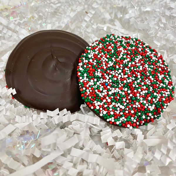 Add a touch of holiday magic with our Two Large Chocolate Nonpareils, available in both rich dark and creamy milk chocolate. Perfect for gifting or savoring, these festive delights bring a merry crunch and a sweet sparkle to your Christmas celebrations!